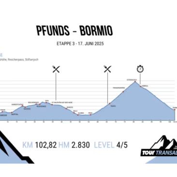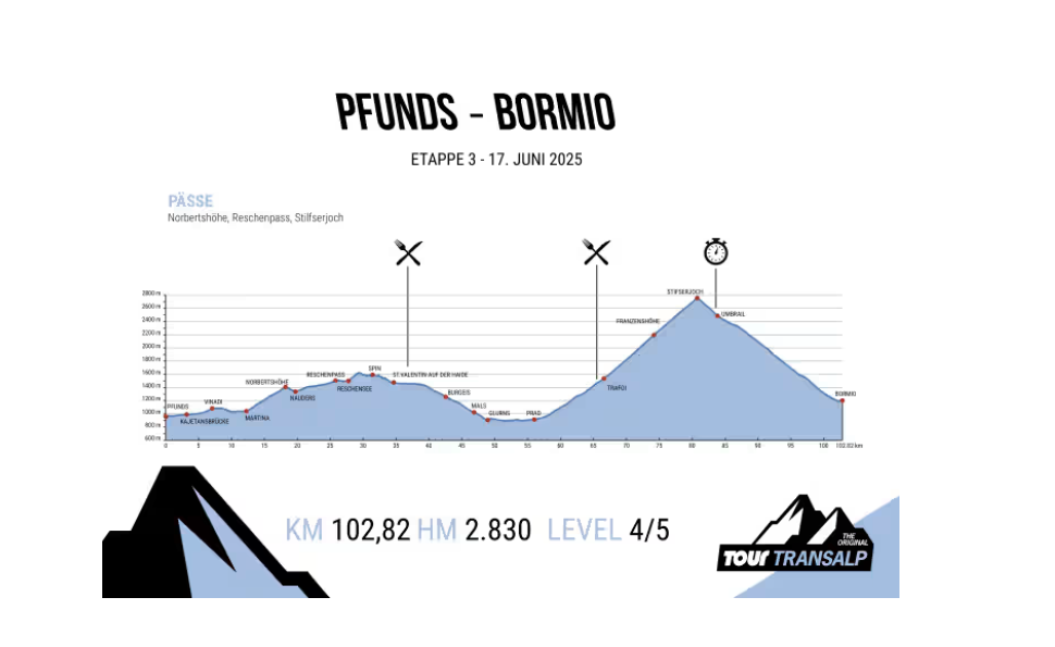 Die Etappe 3 erstreckte sich von Pfunds nach Bormio mit 103 km und 2830 hm. Auf dieser Etappe war das Stilfserjoch zu bezwingen, einer der längsten Anstiege und der höchste Punkt (Seehöhe 2757) der Tour Transalp.