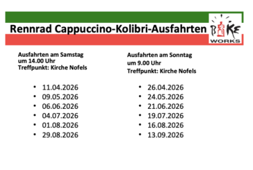 ***Termine für Ausfahrten 2023*** Rennrad-Ausfahrten am Sonntag um 9.00 Uhr, Abfahrt bei Bike Works 07.05., 11.06., 09.07., 13.08.. 17.09.2023 Cappuccino-Rennrad-Ausfahrt am Samstag um 14.00 Uhr, Abfahrt bei BikeWorks 29.04., 27.05., 24.06., 22.07., 26.08., 23.09.2023 MTB Ausfahrten Mittwoch 17:30 … Weiterlesen