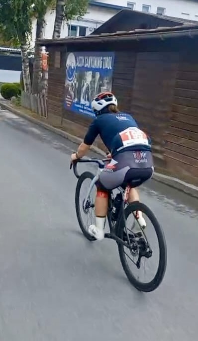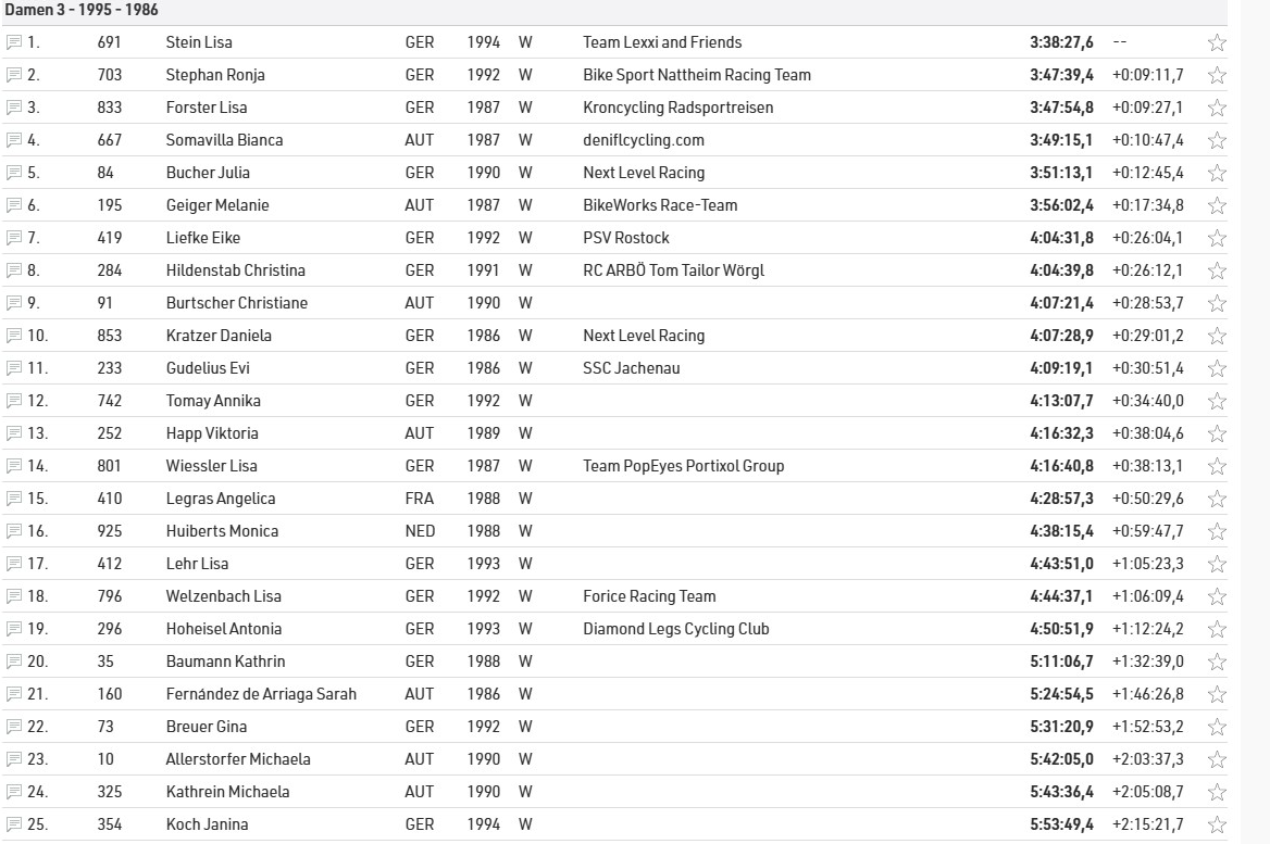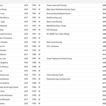 Melanie fuhr die Strecke A mit 110 Kilometer und 2300 hm in einer Zeit von 3:56:02. Glücklich über diese Zeit und überwältigt, die 4h Marke geknackt zu haben, fuhr sie ins Ziel. Somit sicherte sie sich den 6. Platz in der AK.